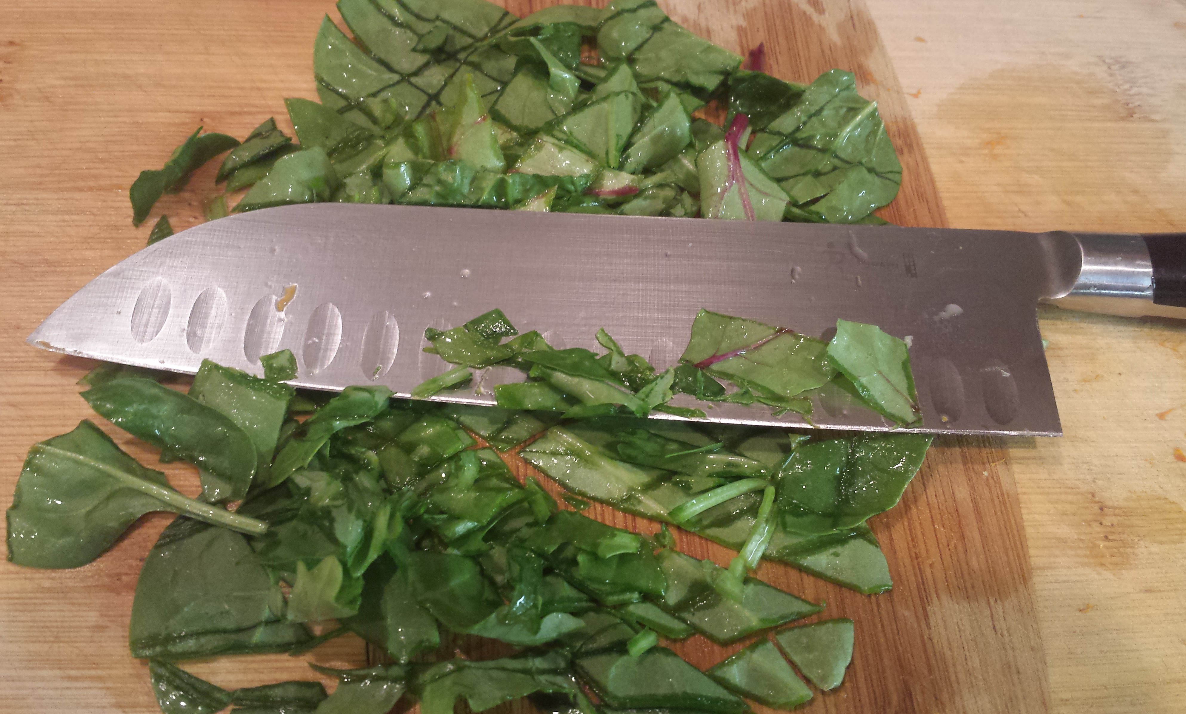- 5 oz (or as I use, 2 large handfuls) of kale or mixed greens, washed, de-stemmed and finely chopped