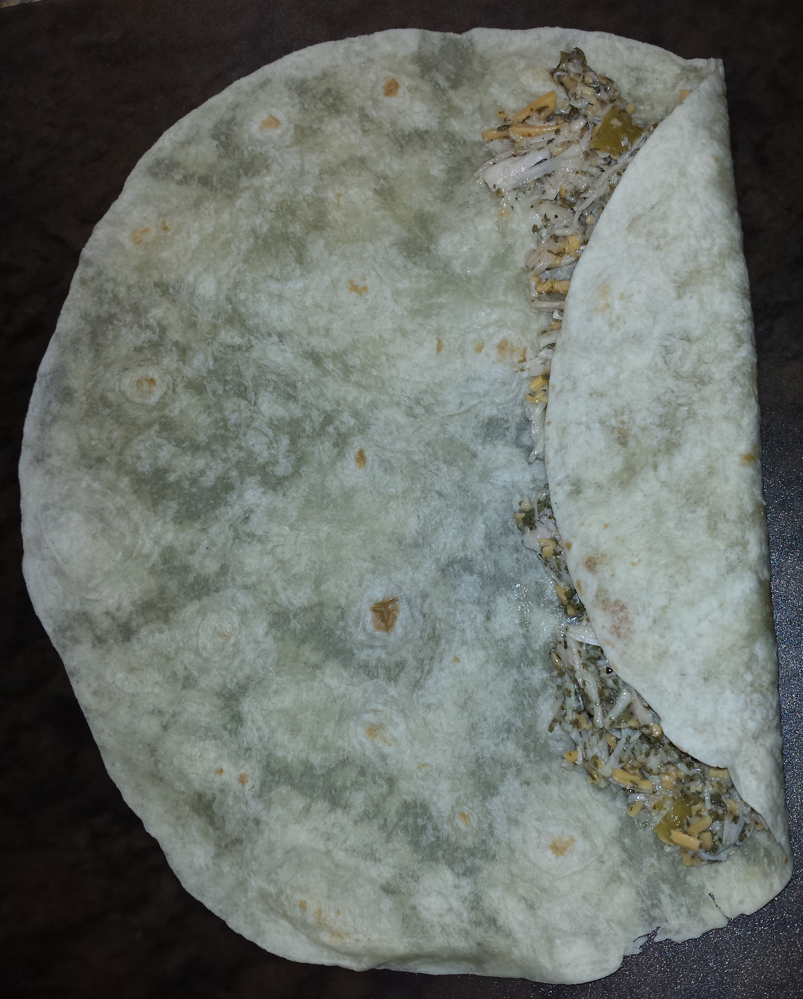 - Put a tortilla on the counter, cutting board, or plate. Place 1/3 cup of the chicken mix onto the tortilla. Then spread it down the tortilla as evenly as possible.