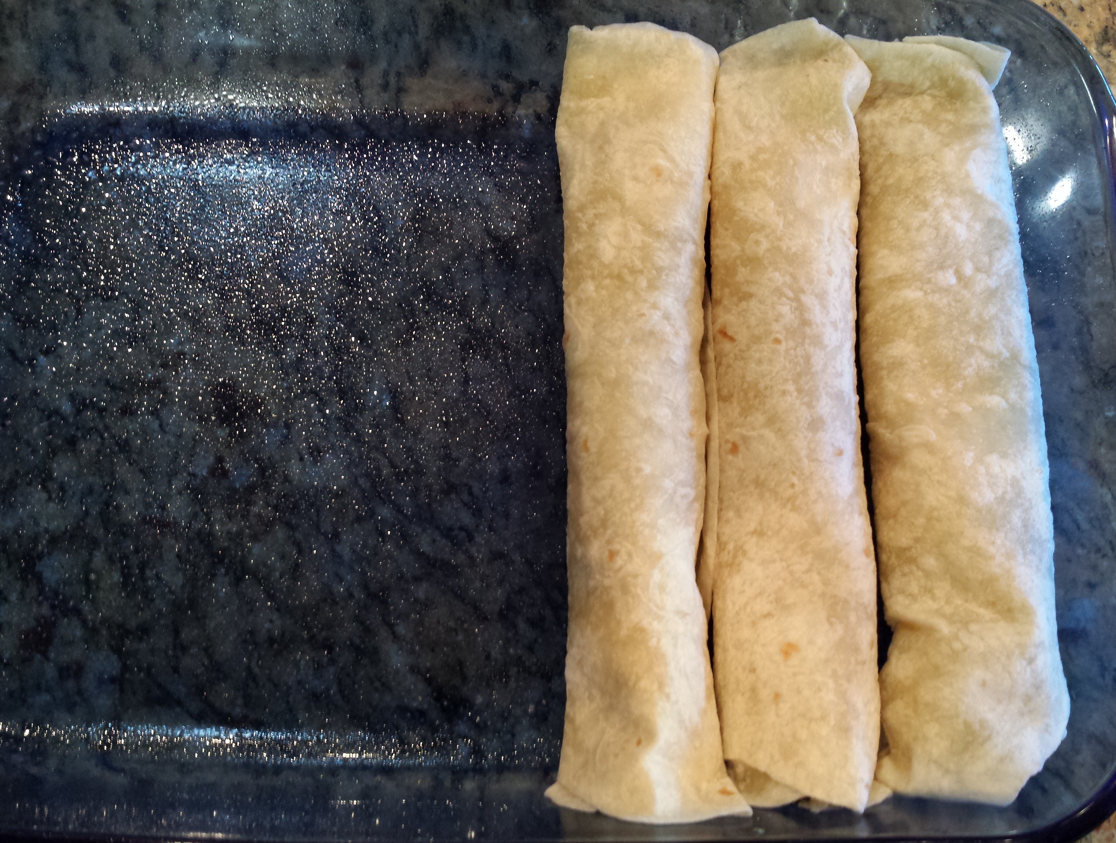 - Lay the tortilla seam-side down in a 9″x13″ backing dish that you have lightly coated with vegetable oil spray.