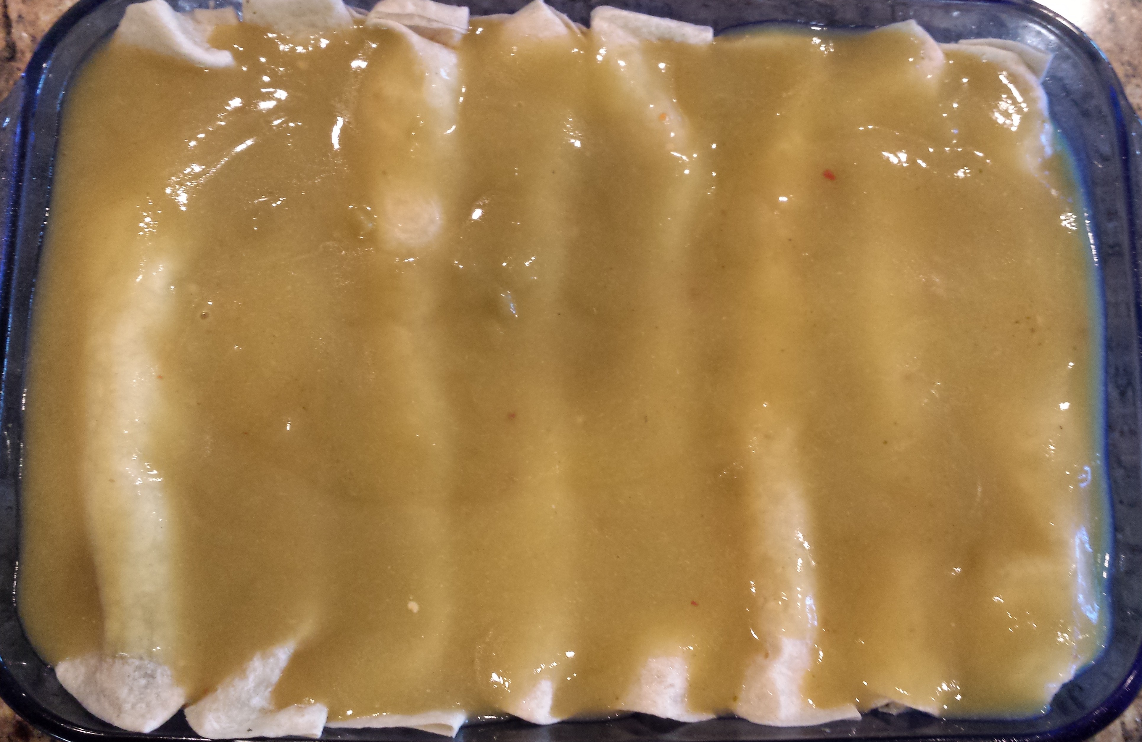 - Lightly spray the enchiladas with vegetable oil spray. Pour the remaining sauce over the enchiladas until they are all coated.