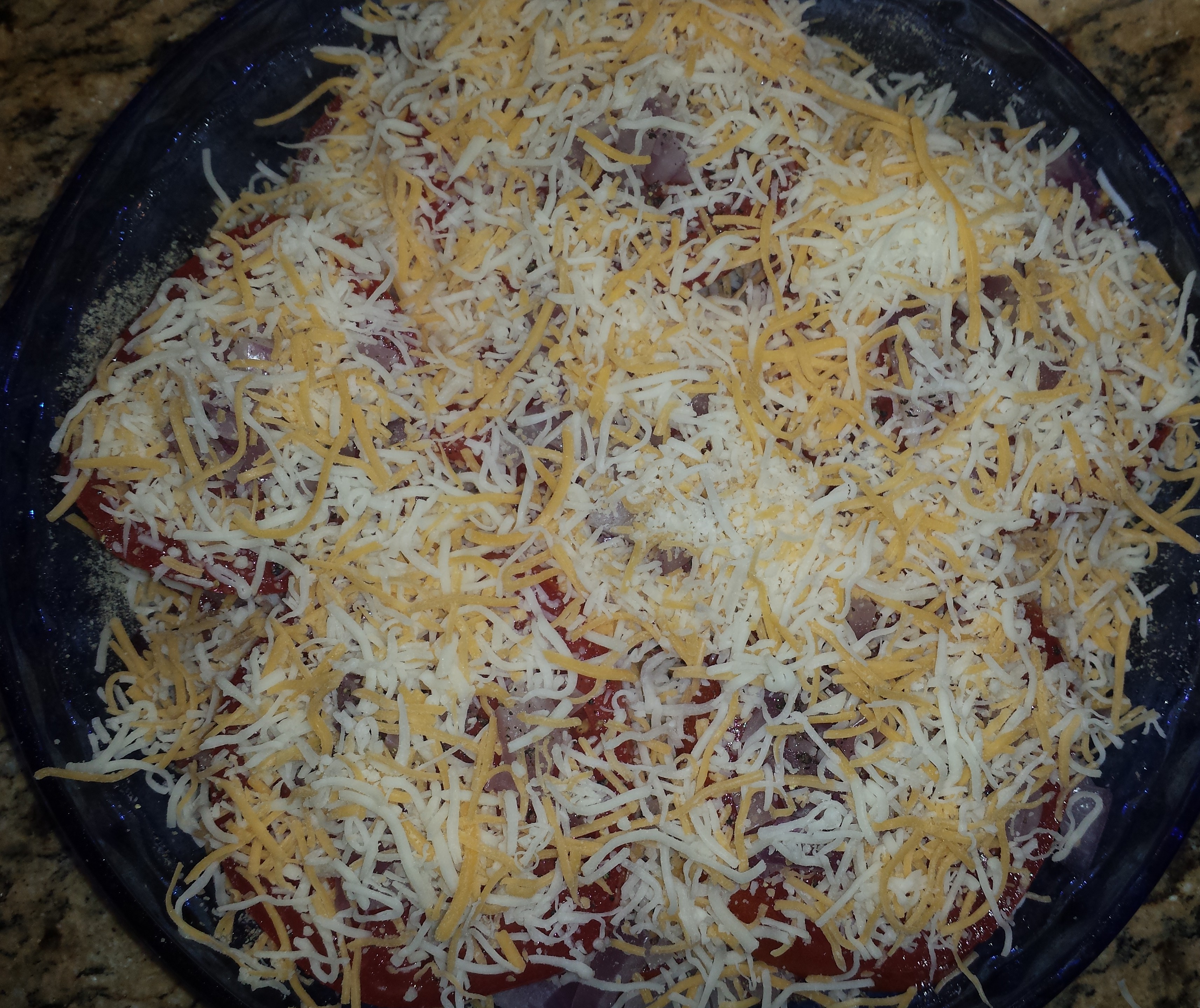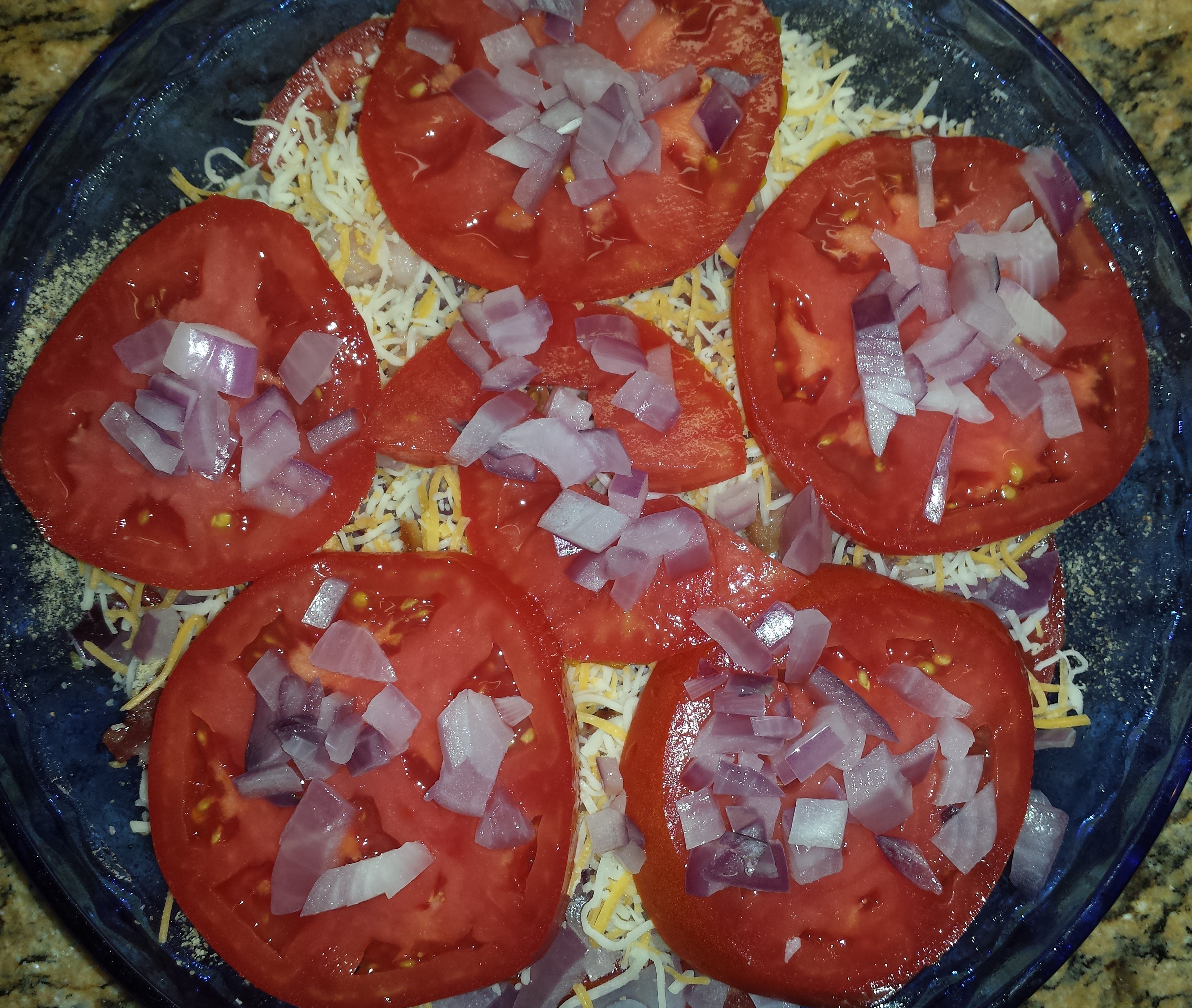 - Repeat with a second layer of tomatoes, onions, and cheese.