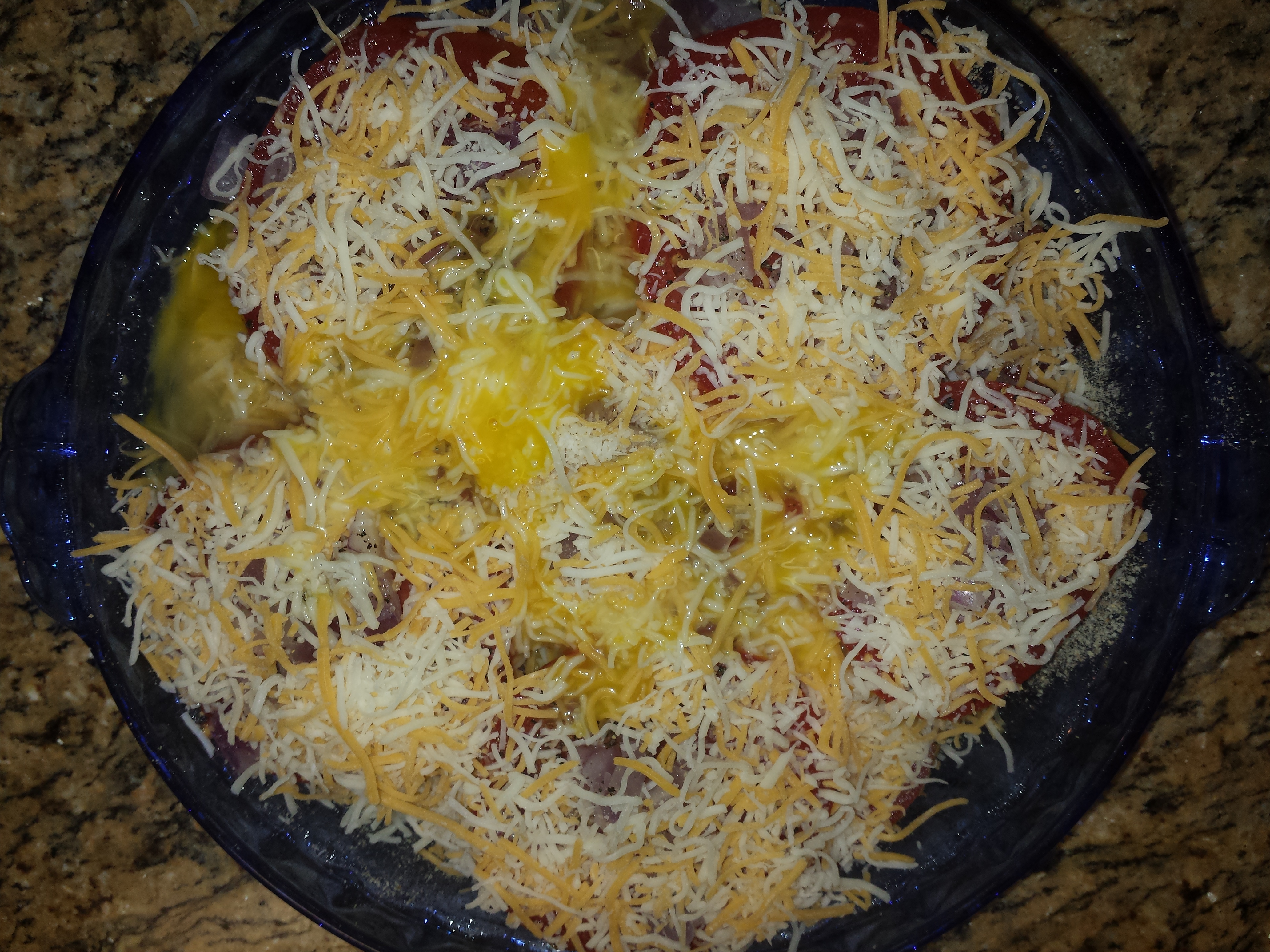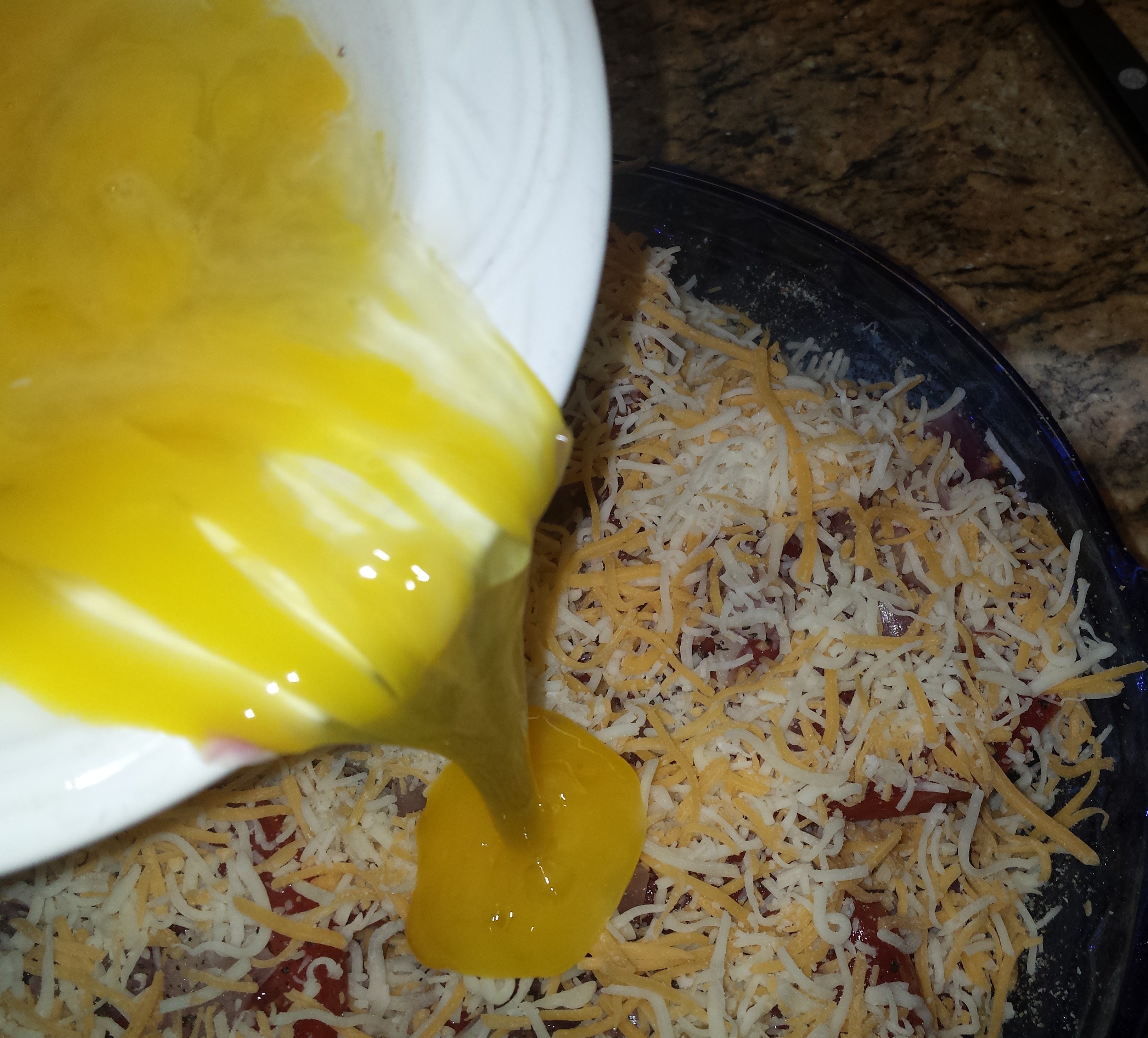 - Pour the beaten eggs over the pie and add salt/pepper (if desired)