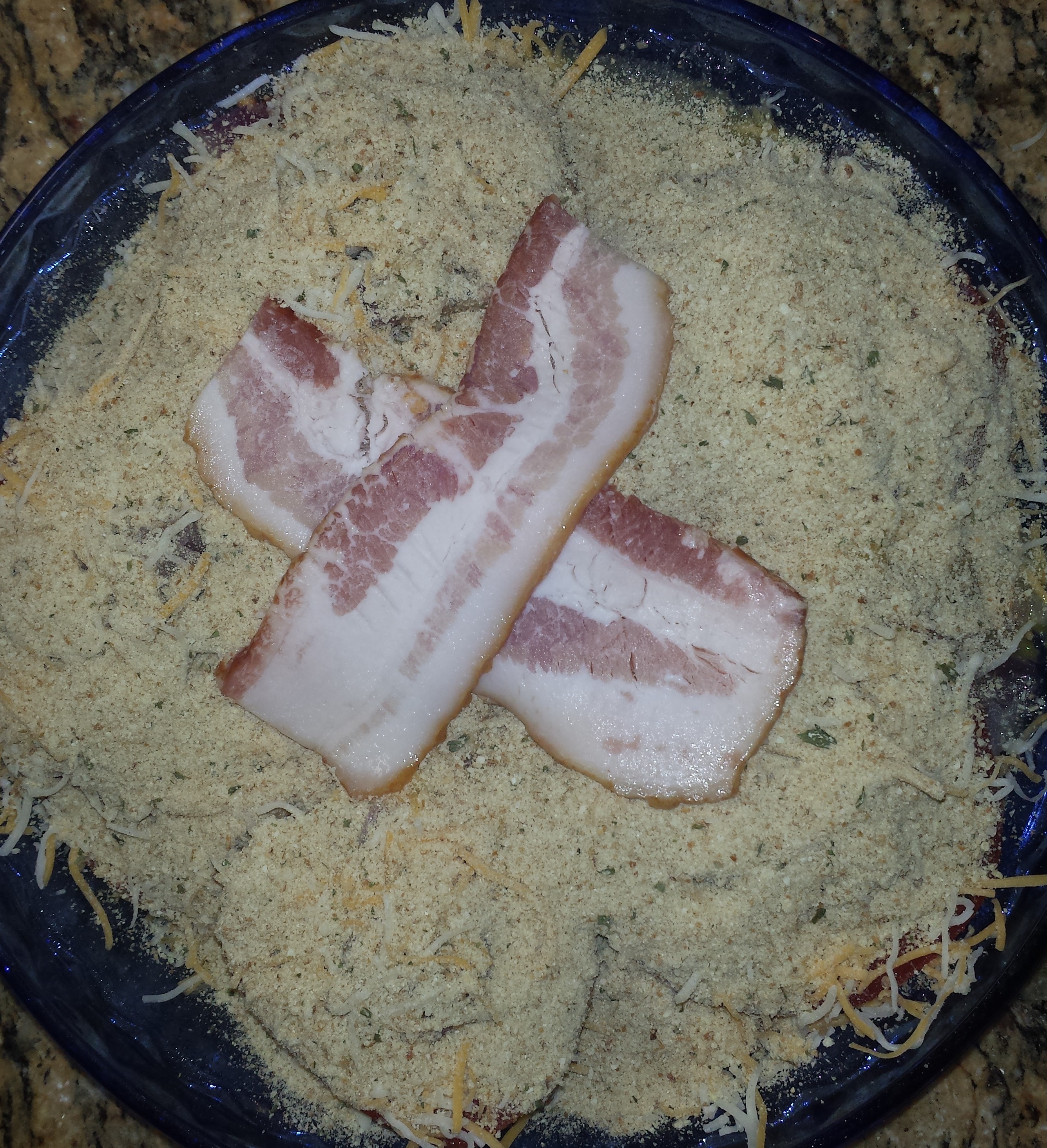 - Arrange the remaining 2 bacon strips on the top of the pie.