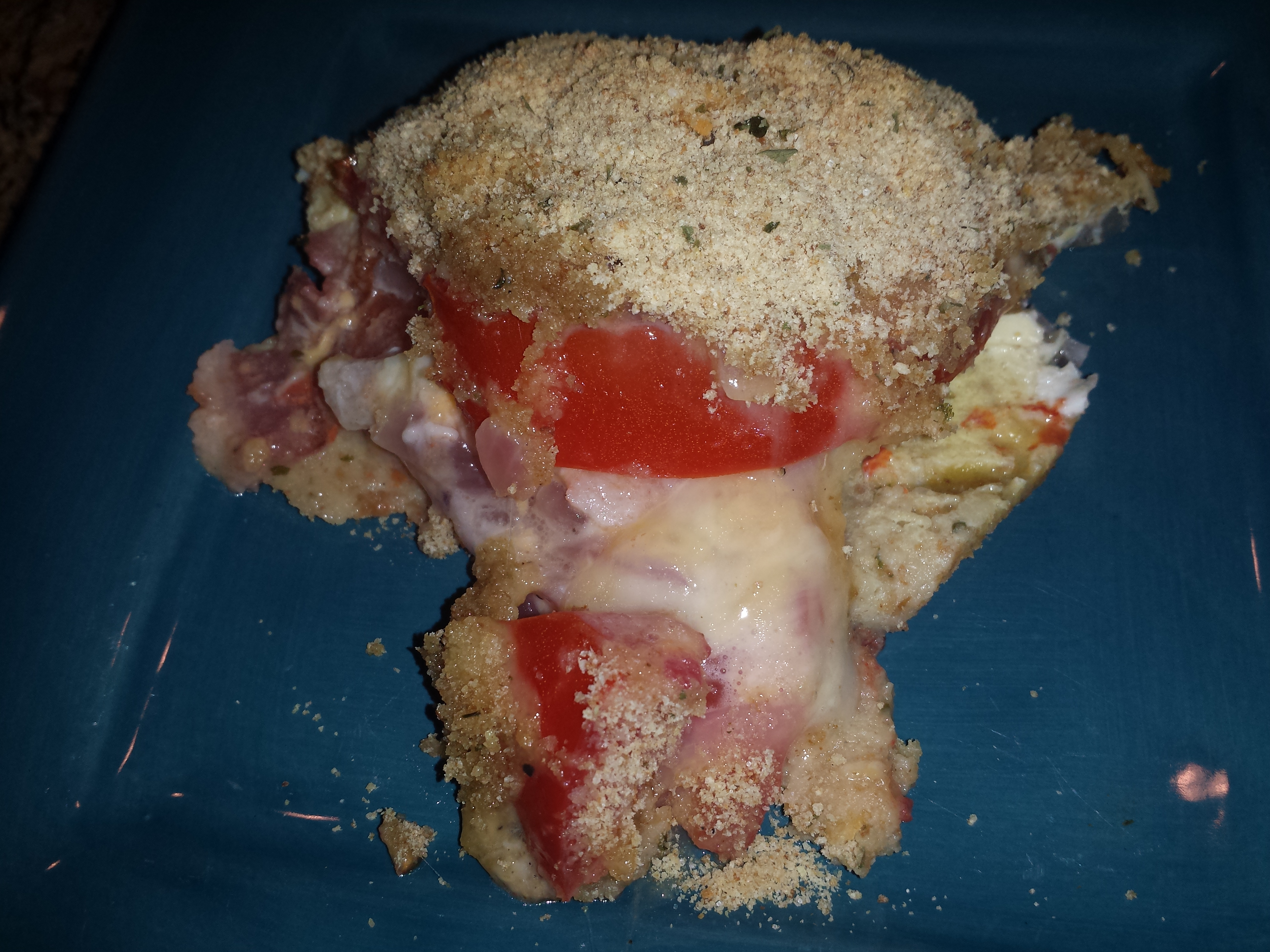 - Arrange 1/2 of the tomato slices on top of the bread crumbs.