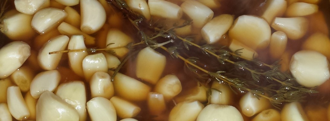- Add 2 tsp of crushed garlic and thin slices of one whole lemon to the bottom of the roasting pan.